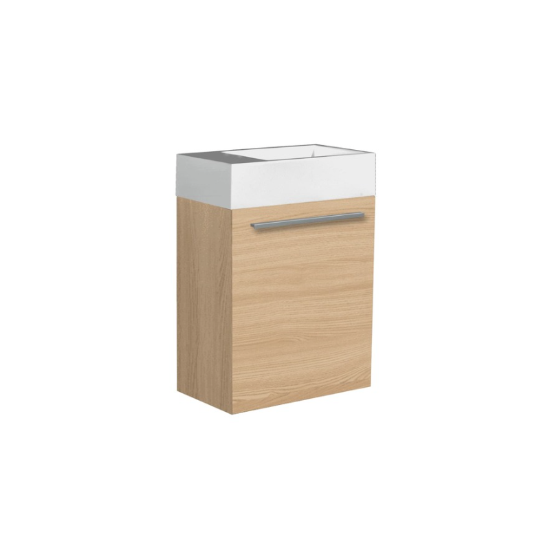Meuble vasque de 46 cm de large et 26 cm de profondeur, finition bois clair. Idéal pour les toilettes ou les petits espaces. Version réversible gauche/droite, par rotation de la vasque ou de la porte.
