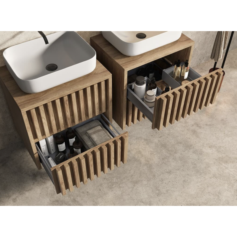 Nous vous présentons notre nouveau produit, le meuble de salle de bain sous lavabo mat en chêne SAT Delano. Ce meuble n'est pas seulement un élément pratique et fonctionnel de votre salle de bain, mais apporte également à votre intérieur une touche de design d'intérieur contemporain - lattes verticales .