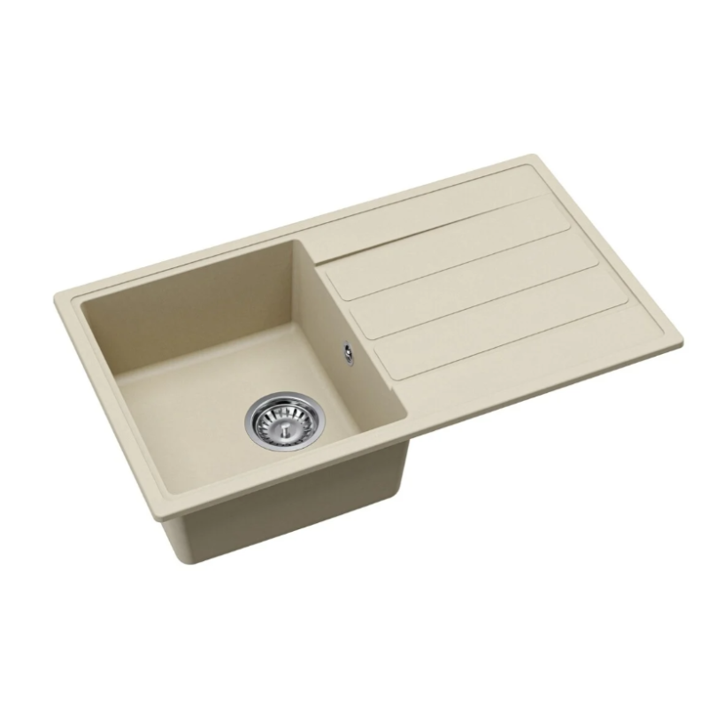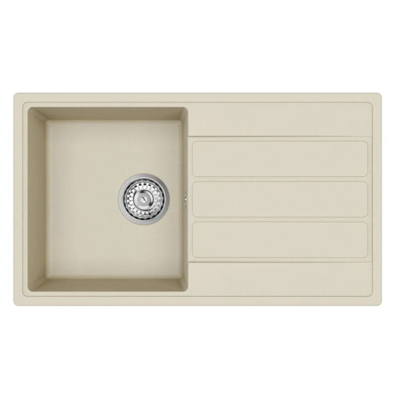 Évier simple en granit avec égouttoir, noir, monté sur un plan de travail de 100x50 cm et 20 cm de profondeur. Convient pour une installation dans une armoire de 60 cm de large.