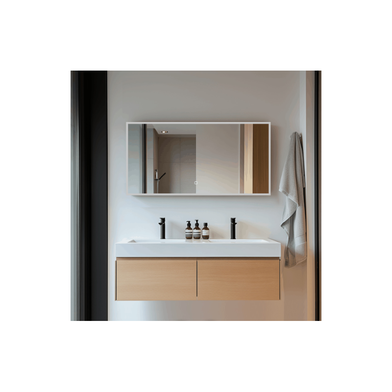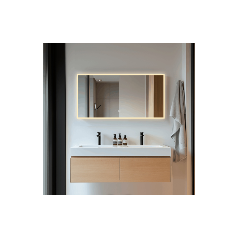 Miroir rectangulaire avec capteur, dimensions 120 x 60 cm. Indice de protection IP44 : résistant aux projections d’eau. Orientation portrait ou paysage. Convient donc aussi bien à une installation au-dessus d’un lavabo double qu’à une installation verticale, par exemple dans une entrée ou un vestiaire.