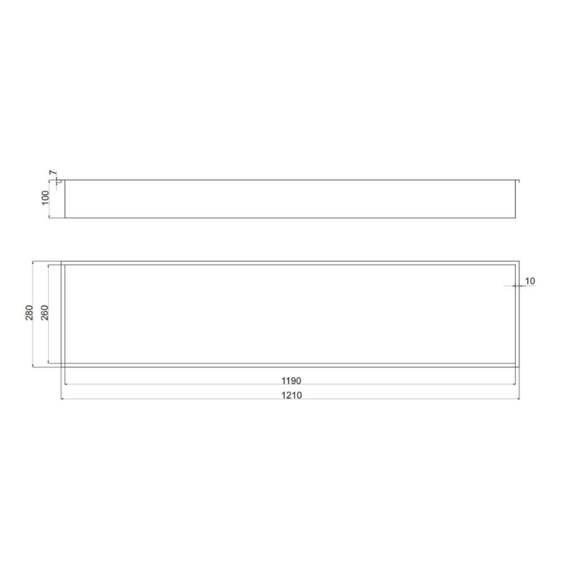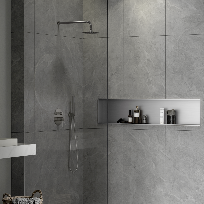 Niche de salle de bain en acier inoxydable de haute qualité de couleur acier brossé, dimensions 121x28 cm, profondeur 10 cm et avec un cadre autour de la niche.