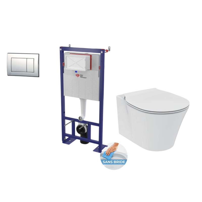 Ce pack Connect Air E008701 se distingue par sa chasse d’eau révolutionnaire et son aspect en porcelaine vitrifiée carénée. Dotée de la technologie AquaBlade, cette cuvette Ideal Standard E008701 affiche une performance hors du commun. En effet, la surface rincée peut atteindre les 90% grâce à son système de chasse d’eau propulsée du haut de la cuvette. Et sans bride, cette cuvette Ideal Standard E008701 se relève être plus hygiénique. N’oublions pas que la bride est considérée comme un nid à bactéries puisque ces dernières se trouvent souvent piéger sous le rebord intérieur.