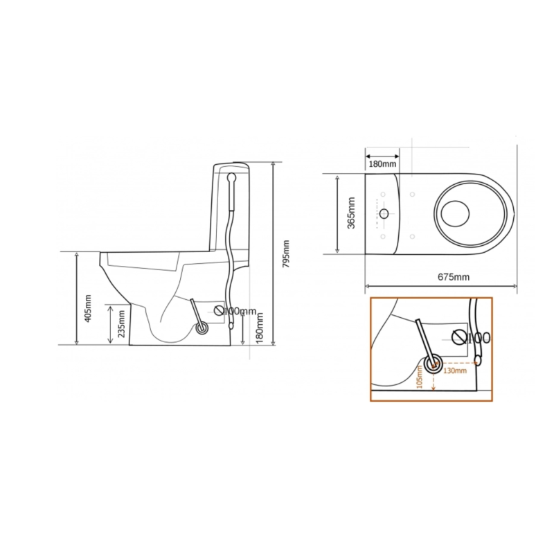 - Abattant frein de chute : Oui. Dimensions (mm) : Hauteur : 795. Largeur : 365. Profondeur : 675. Hauteur d'assise (Sans abattant) : 405. Diamètre d'évacuation : 100. Hauteur sol / évacuation : 180.